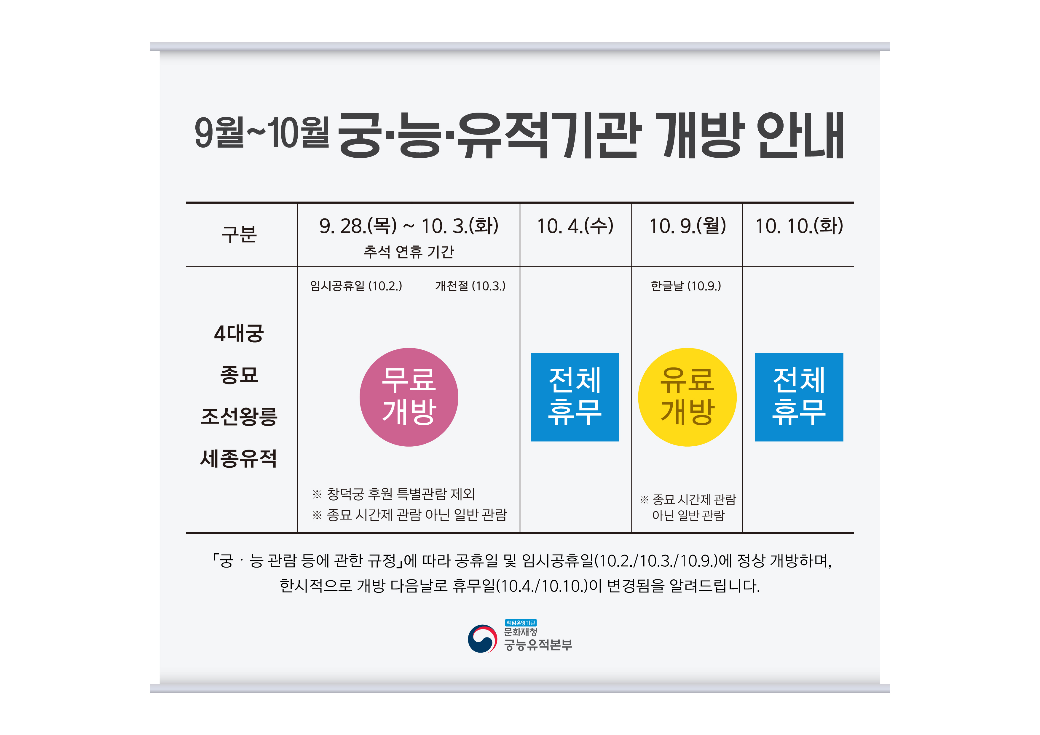 경복궁과 칠궁은 10.3.(화) 정상 개방하며, 10.4.(수) 휴무일로 변경됨을 알려드립니다.